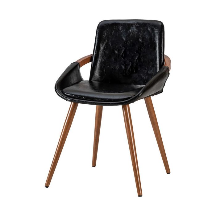 Cadeira Rita Preta Base Madeira Pintada Para deixar o seu ambiente moderno e elegante, a Cadeira Rita, é a peça ideal para compor a sua decoração. Base em aço com aplicação de adesivo simulando madeira. Revestida em Courino Preto, no assento e estofado, tem a estrutura em madeira. Seu detalhe, em madeira, nos braços dá aquele charme a essa peça. Uma ótima opção para ser usada com a Mesa de Jantar Ivy , com base possui estrutura de aço entrelaçado e tampo de madeira, o seu ambiente ficará perfeito!Detalhes do Produto Suporta até 120kgs