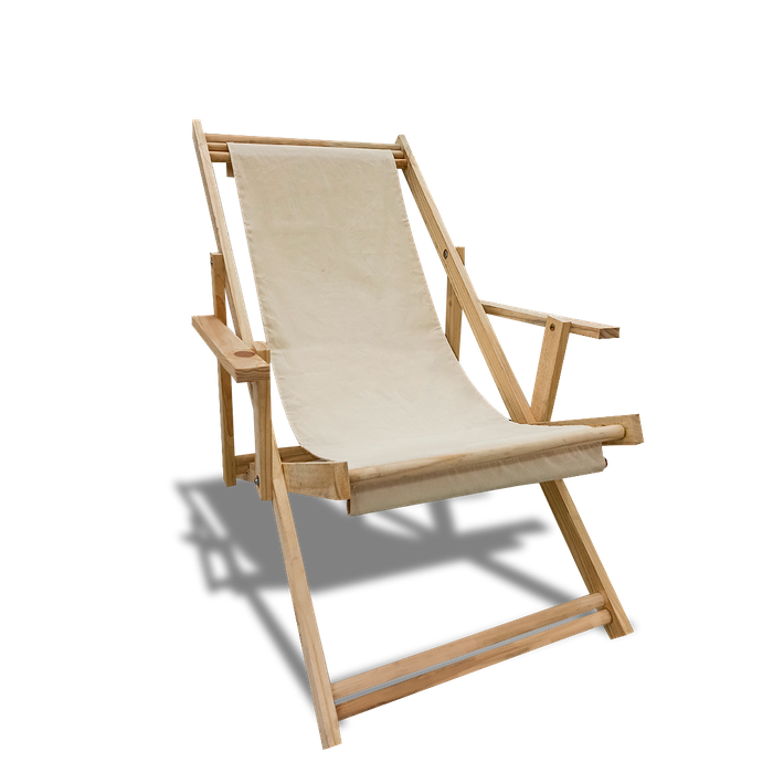 Feita com madeira Pinus, cor Natural, sem acabamento, totalmente dobrável e reclinável, com braços para descanso. Suporta até 120 Kg e conta com 4 níveis de regulagem. Assento em algodão. Sendo 100% natural.