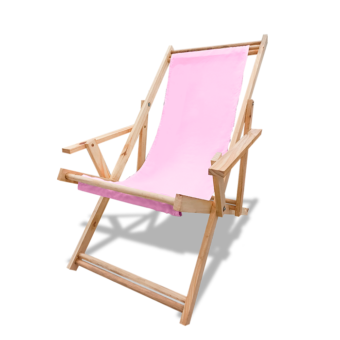 Feita com madeira Pinus, cor Natural, totalmente dobrável e reclinável, com apoio de braços para descanço. Suporta até 120 Kg e conta com 4 níveis de regulagem. Assento em Lona Bagum.