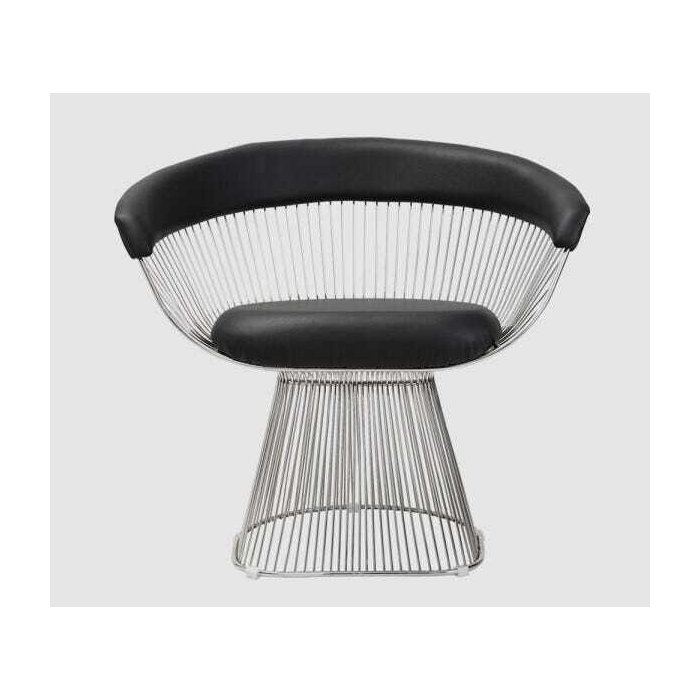Designer Warren Platner, 1962.Fios de Aço, Assentos Revestidos. Na década de 1960, Warren Platner transformou fios de aço em uma coleção de mobiliário escultural, criando o que agora é considerado um ícone de design da era contemporânea. Formas harmoniosas da Coleção Platner, produzidas por soldagem fio-máquina de aço para estrutura circulares, produzindo um efeito moiré, que captura o decorado de forma suave e com uma qualidade graciosa que Platner procurou alcançar. Todos os componentes metálicos são terminados com uma camada protetora de brilho.