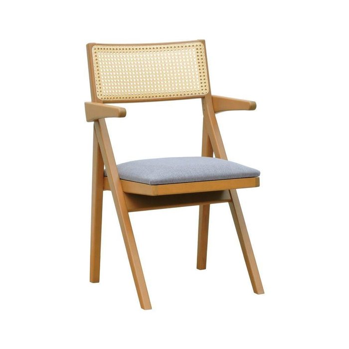 Cadeira Ypê Com Braços Madeira Maciça E Telinha Natural - Natural Assento Estofado Linho Cinza Mescla Impermeável