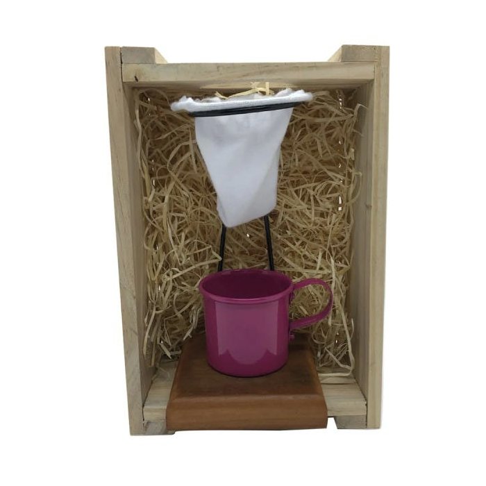 Esse kit é composto pela base madeira de demolição, coador de pano, 1(uma) canequinha, uma caixa de madeira do tipo engradado.