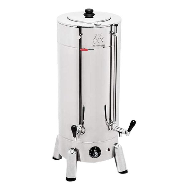 Aquecimento em banho maria, tendo duas cubas para armazenar o líquido, e suas torneiras horizontais com visor de nível para água e para o café.