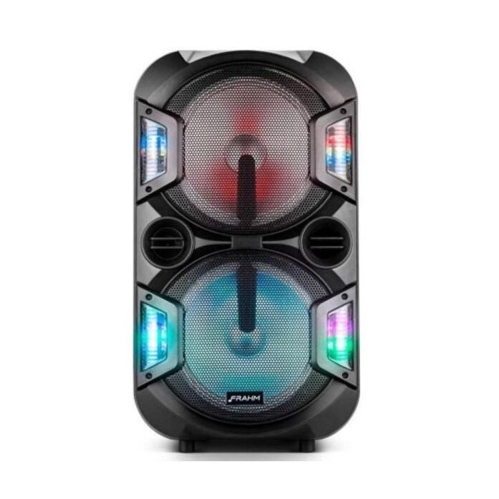 A caixa tf 600 bt possui potência de 900w, e foi projetada para fazer parte de seus momentos especiais, onde se faz necessário praticidade e conectividade. As conexões de mídias trazem as principais tecnologias para transmissão de áudio: bluetooth , usb, micro sd, fm, além de possuir entrada p2 que se conecta com qualquer equipamento com saída de sinal de áudio, como notebooks, tablets, entre outros. também possui duas entradas p10 para microfone ou instrumento musical, como violão, guitarra, teclado entre outros. Os equalizadores de graves e agudos proporcionam ao usuário ajuste fino das frequências, possibilitando personalizar ao gosto do usuário suas músicas e dando ênfase em sua faixa de frequência preferida, sendo elas baixas ou altas Sua bateria interna de lítio com autonomia de até 6h em volume médio dão portabilidade para sua playlist, seja em festas, parques, camping, praia ou em qualquer lugar sem necessidade de estar conectada e rede elétrica. Seu transporte é facilitado com uso da alça retrátil e de rodas. os leds que iluminam os dois falantes de 10" são o efeito que qualquer festa precisa, além dos leds laterais projetarem no ambiente os efeitos de luz. Marca: Frahm