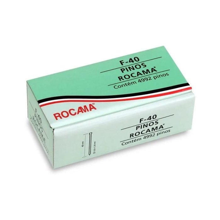 1 caixa com 4992 pinos originais Rocama F40Aplicações:Móveis, montagem de cadeiras, marcenaria, peças freadas, estofados, janelas, portas, urnas funerárias, entre outrosO anuncio é apenas da caixa de grampos, as fotos dos grampeadores são apenas informativas, os grampeadores não acompanham o produto