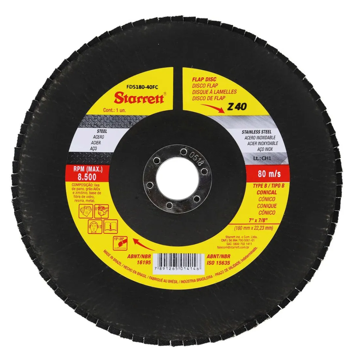 O Disco de Flap 7" grão 40 Starrett FDS180-40FC é indicado para desbaste pesado em aço inox e metais em geral. Com grão grosso, proporciona remoção rápida de material, permitindo alto desempenho em trabalhos que exigem velocidade e eficiência. O formato e qualidade Starrett garantem durabilidade e acabamento uniforme.