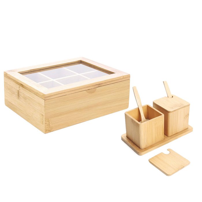 Organizador de cha com 6 divisorias e porta condimentos. A Caixa de Cha traz a inovaçao ecologica do material de bambu com agentes bactericidas, que previnem o aparecimento de fungos e bacterias. Sao resistentes, leves e com menor absorçao de liquidos, se forem bem conservados, nao ficam escuros com facilidade. Perfeito para armanezar ervas para cha e especiarias para preparaçao de drinks. Porta condimentos duplo em bambu com tampa e colher, ideal como farinheiro e temperos diversos.