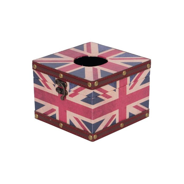 Muita modernidade e minimalismo para decoração da sua casa ou para presentear alguém especial, com essa caixa porta papel em madeira, com acabamento vintage e tachas em suas terminações, tem como desenho principal a bandeira da Inglaterra, abertura na tampa facilitando a utilidade e fecho dianteiro de metal, detalhes desenvolvidos exclusivamente para a peça. Ideal para decoração de ambientes internos, presentear e por que não, para decoração de festas, aniversários e casamentos A escolha perfeita para quem procura o diferente e sofisticado, sem exageros.