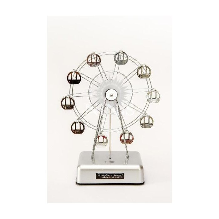 Encantadora caixa de música giratória em forma de roda gigante com 10 bancos e base na cor prata. Possui uma fonte de luz Led que emite luzes multicoloridas piscantes dando um efeito todo especial em ambientes com pouca iluminação ou à noite. Possui as funções de música, iluminação e giro ou apenas giro e iluminação