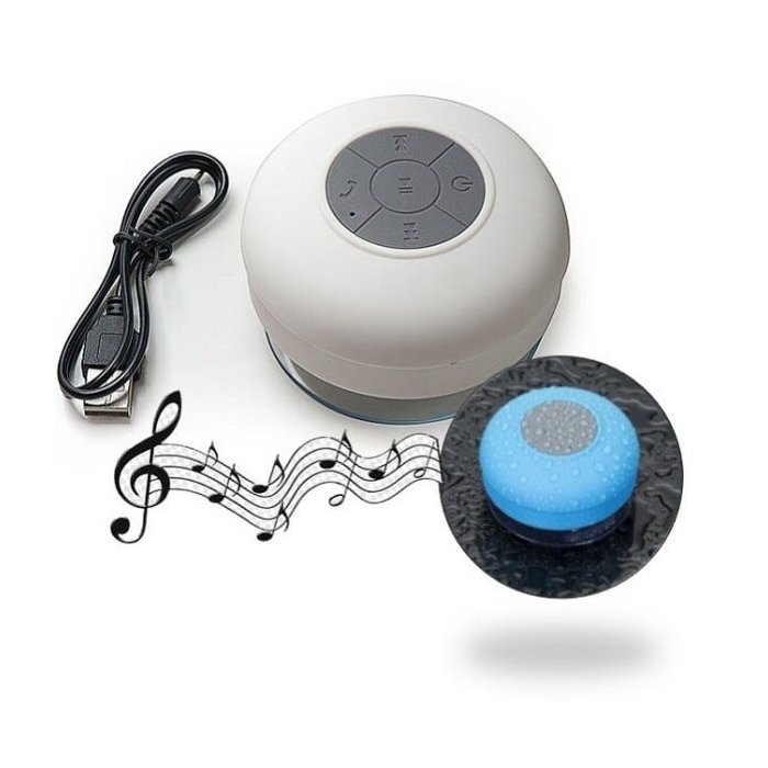 Mini Caixa de som bluetooth resistente a água. Com uma ventosa, você pode fixar ela no azulejo e vidros. Escute um som de qualidade enquanto toma banho, ou enquanto está curtindo uma piscina com os amigos e família! Não recomendamos usá-la totalmente submersa a água.