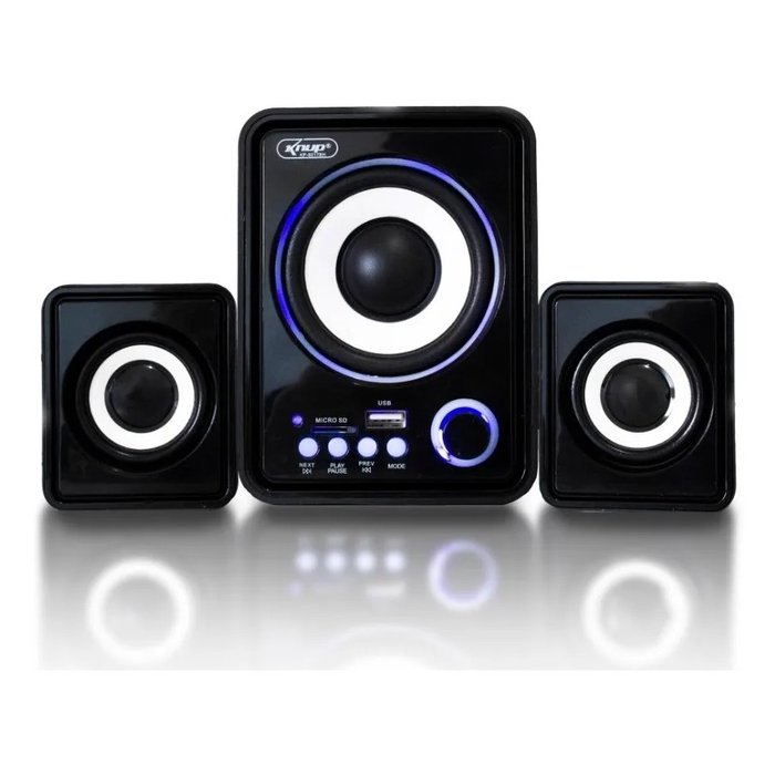 Caixa de Som com subwoofer para reforço dos graves. Possui design moderno na cor preta e LED decorativo na cor azul.