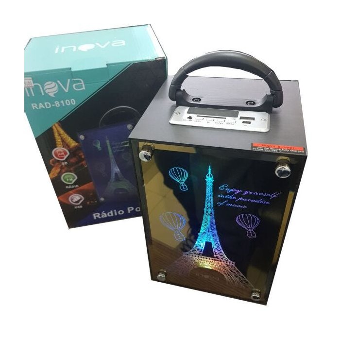 Caixa de som inova modelo rad 8100 desenho do alto falante caixa portátil descrição: unidade de alto falante: 2 e 3 potência de saída: 2 8w especificações de bateria: bateria de lítio embutida 3.7v, 2000 mah fonte de alimentação usb externa: dc 5v 1.5 A relação sinal / ruído: s/n: 80 db resposta de frequência: 200hz banda fm: 87.5 108 mhz tempo de reprodução de música: 5 horas devido ao volume e ao conteúdo de áudio variam material: abs e fibre de vidro e vidro modo de reprodução: sem fio, usb, tf, fm, aux itens inclusos: 1 caixa de som rad 8100 1 cabo aux p2 x aux p2 1 cabo micro usb x usb, mostrador digital Medida do produto: C 14 x L 14 cm x A 31 cm: Peso grama: 1300