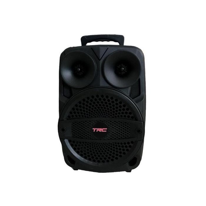 A Caixa de som amplificada da TRC possui alça de transporte e rodas, 700W RMS de potência, conexões Bluetooth e USB, entradas para guitarra e leitor de cartão. O produto ainda apresenta 2 auto falantes de 10 polegadas, rádio FM, antena interna, iluminação frontal em LED e bateria interna recarregável.