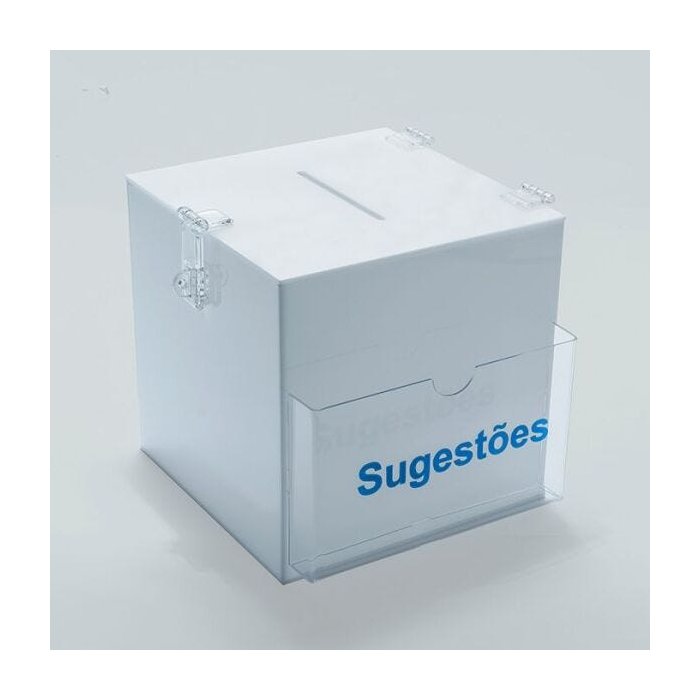 Fabricada em acrílico no tamanho ideal para utilizar em lojas e empresas para pesquisas com os clientes ou então para colocar cupons. Possui abertura na parte superior para a passagem de papéis, e na parte da frente contém uma bolsa para armazenar os formulários,e personalização com adesivo. Contém encaixe para cadeado (a peça não acompanha cadeado).