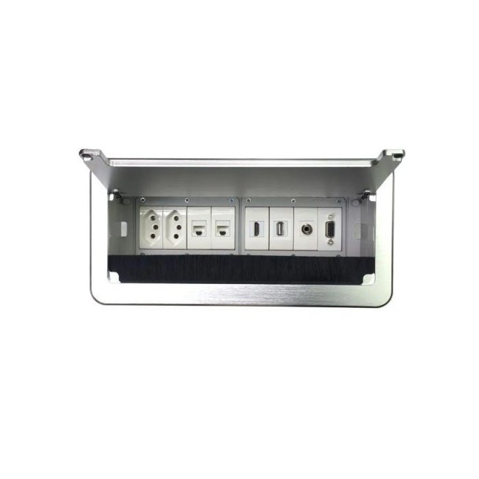 Caixa De Tomadas Para Mesas Completa Com Multi Conexões, fabricada em alumínio anodizado, capacidade para até 8 conexões diversificadas como Tomadas, HDMI, Rede, Telefone, USB, VGA. Possui colarinho e tampa em alumínio e fundo em ABS de engenharia PVC.