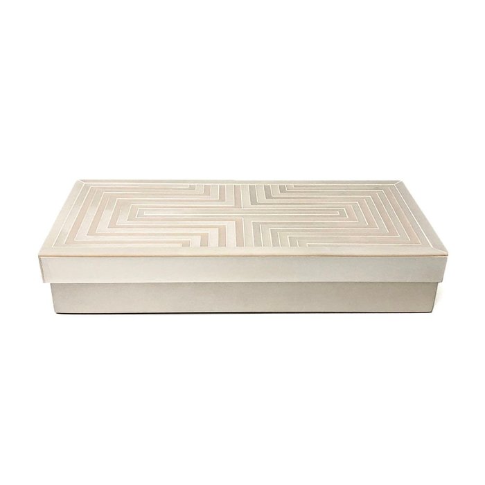 Caixa decorativa retangular, produzida artesanalmente a partir da madeira e do vidro. É composta por padrões geométricos na tampa em um tom que remete ao madrepérola, concedendo sofisticação e requinte. Já o seu interior é forrado com veludo marrom-claro.