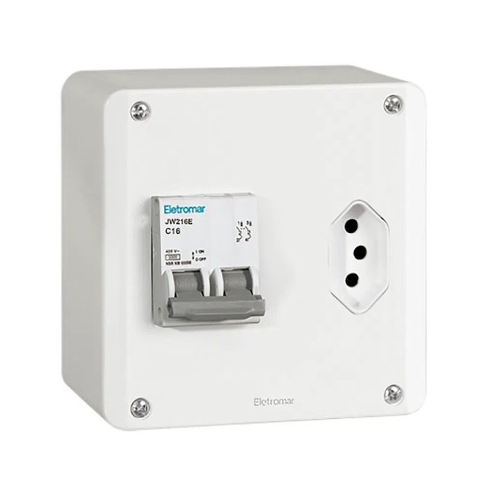 A caixa com dois polos é perfeita para a instalação de ar condicionado ou equipamentos que demandem bastante energia elétrica até 16A.