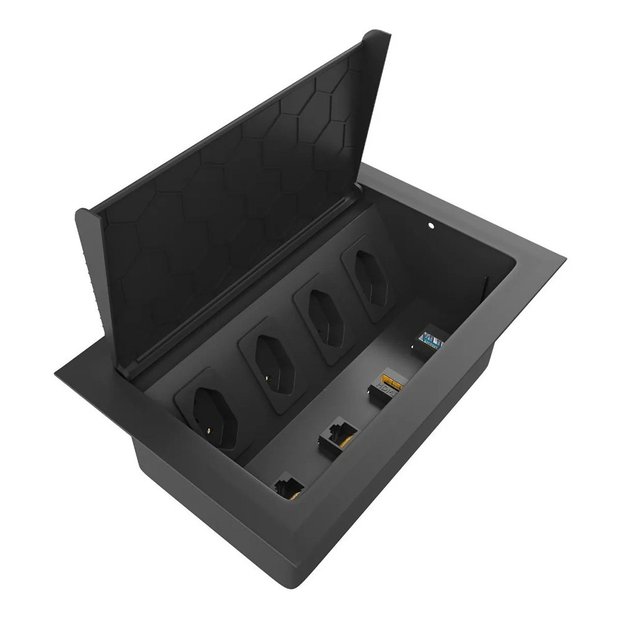 - Indicada para montagem em mesas de reunião, salas de conferência, salas de treinamento, showrooms e escritórios. O produto proporciona ao usuário praticidade na hora de fazer as conexões elétricas, de vídeo, de dados e rede.