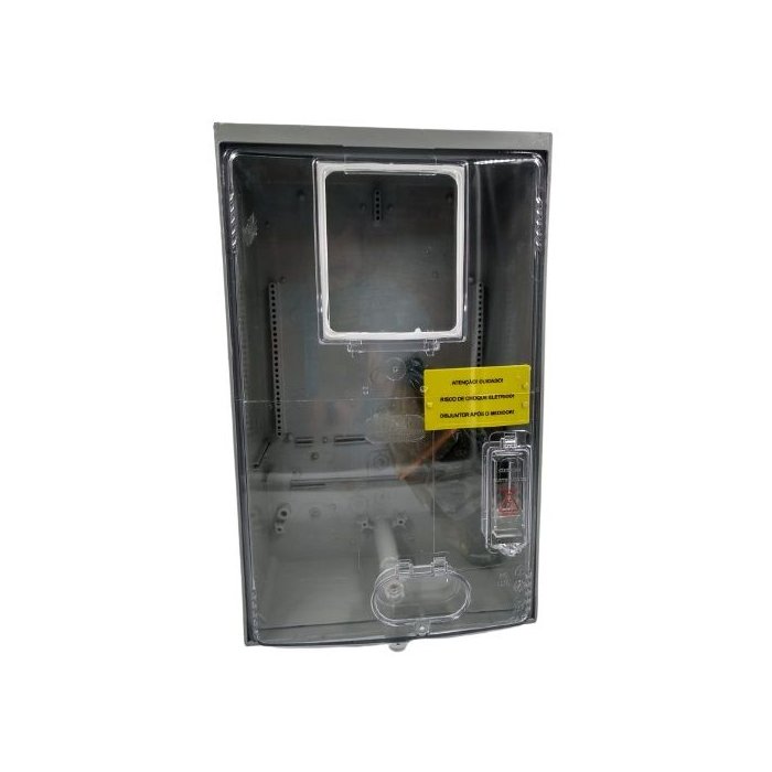 A caixa para medidor monofásico é confeccionada em policarbonato com proteção U.V. e antichama. A geometria funcional da peça permite um acoplamento perfeito em caso de montagem de painéis de medição monofásicos, facilitando a confecção de quadros para agrupamento. A tampa possui sistema que permite a aplicação de lacre e parafuso de segurança, além da janela de acesso ao disjuntor DIN/NEMA com orifício para aplicação de cadeado.Possui pré-cortes nas faces externas para entrada de eletrodutos de ¾" e 1_, além de pré-corte inferior de ½" para aterramento. Para fixação do medidor, possui sistema de travessa regulável, permitindo a utilização de diversos padrões do mesmo. Possui no fundo do corpo suportes para passagem de cinta metálica para fixação do conjunto em poste (opcional).