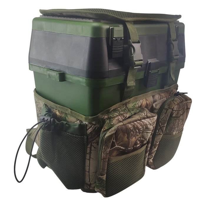 A Caixa Bolsa de Pesca (Fishing Box) proporciona a você transportar nas costas todos os acessórios necessários para sua pescaria, deixando suas mãos livres para outras necessidades. Feita de material super resistente e rígido protege suas carretilhas, molinetes e tudo que conter dentro dela. Além de você poder utilizá-la como um banco para poder se sentar sobre ela possuindo uma almofada que lhe proporcionar um maior conforto. Possui 4 estojos na tampa ideal para guardar todos os seus equipamentos de pesca. Além de contar com alça para ombro removível (para uma melhor locomoção). Além dos estojos internos, a bolsa possui diversos bolsos na parte externa, 2 bolsos frontais, 2 bolsos laterais e 1 bolso traseiro (grande).