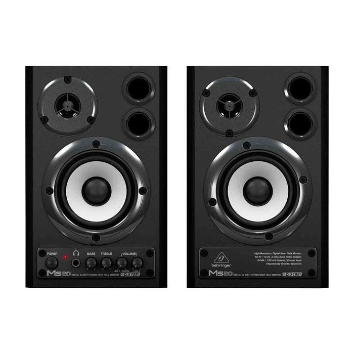 MONITOR de REFERENCIA MS20 BEHRINGER | PAR | 20W MODELO: MS20 MONITOR BEHRINGER Descrição: Monitor de estúdio ativo de 2 vias perfeitamente adequado para computadores, estações de trabalho de áudio/multimídia e monitoramento de teclado. Ficha Técnica: - Amplificadores de 2 x 10 watts embutidos e com alto headroom; - Potentes woofers de 3" e tweeter de alta resolução que fornece uma resposta de frequência linear; - Conversores D/A de alta resolução de 24 bits/192 kHz para alcance mais dinâmico; - Entradas ópticas para conectar diretamente fontes de áudio digital pela interface S/PDIF; - Controles de volume individuais para entrada de linha e para os controles bass e treble EQ; - Conector de fone TRS ¼'' com função de alto-falante de auto/mute facilmente acessível no painel dianteiro; - Blindagem magnética. Obs.: As informações e fotos deste produto são fornecidas pelo fabricante, sendo inteiramente de sua responsabilidade. Fabricante: BEHRINGER Monitor de Referencia | Controles de volume: graves e agudos | MS20 Behringer