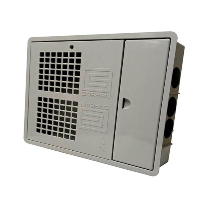 O corpo de proteção para hidrômetro padrão corsan é confeccionado em policarbonato (pc) com proteção u.V e anti-chama. Possui dois compartimentos separados por uma divisória plástica, sendo um compartimento para o hidrômetro e outro para o registro. Possui nas faces laterais orifícios de entrada e saída para a tubulação. Para a instalação embutida, a construção da caixa garante maior aderência junto ao reboco contendo nervuras laterais. A tampa do compartimento do hidrômetro da caixa de proteção é confeccionada em policarbonato (pc) com proteção contra raios u.V. E anti-chama. A peça foi projetada com sistema de canaletas que auxilia no fechamento da caixa, possui área gradeada para visor de leitura. Apresenta um espaço para o logotipo da corsan. Pode apresentar dois orifícios de 25mm de diâmetro para o acesso ao registro sem necessitar a abertura da tampa. Além desta tampa, o produto apresenta outras duas tampas, que dão abertura ao compartimento do registro. São confeccionadas no mesmo material, e apresentam fecho de esfera para realizar o travamento ao fechar. Acessórios tampões laterais em polipropileno (pp); pinos de fechamento em policarbonato (pc); parafuso estriado em latão.