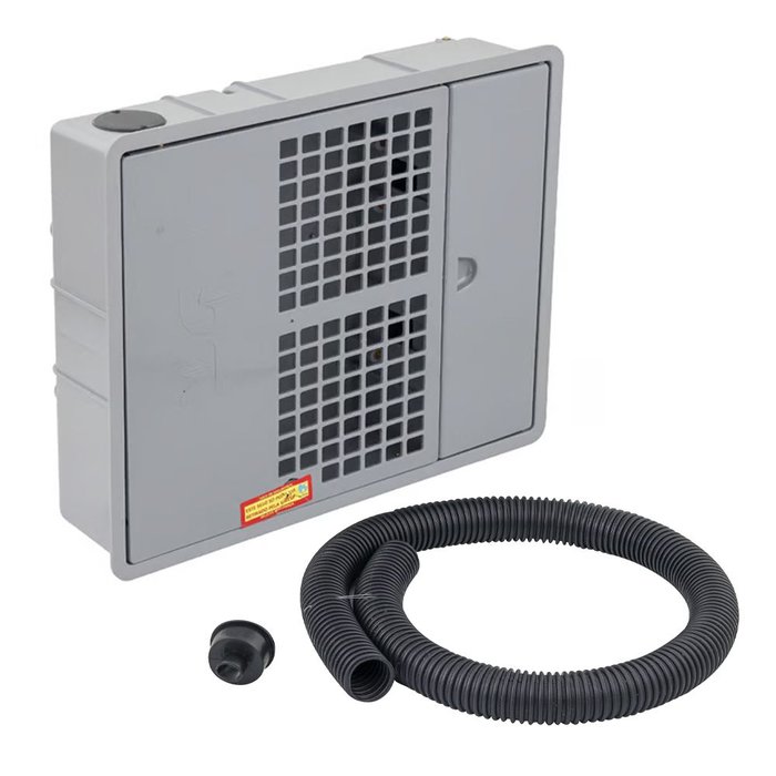 - Possui dois compartimentos separados por uma divisória plástica, sendo um compartimento para o hidrômetro e outro para o registro.