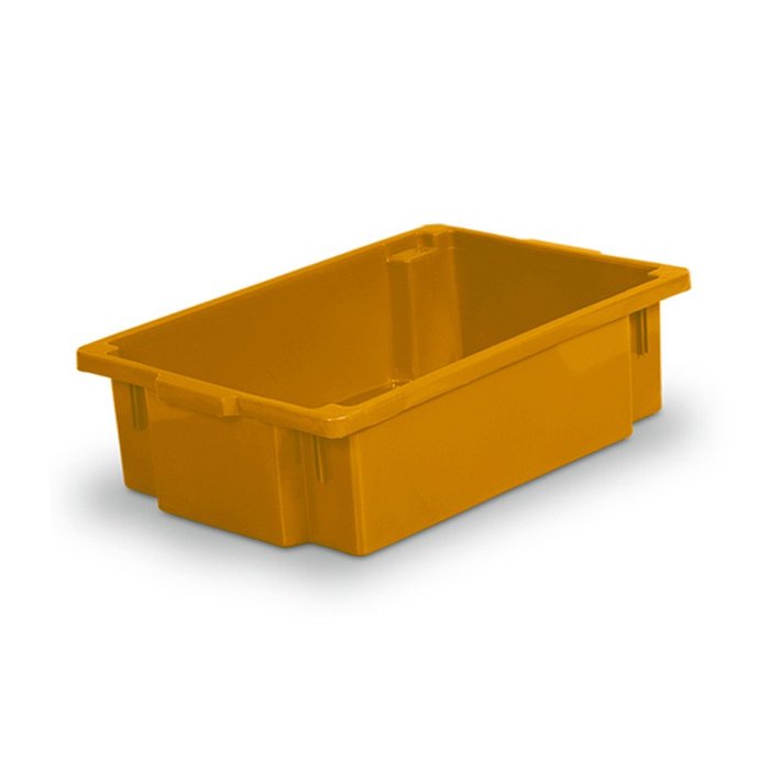 A caixa possui alças laterais, é empilhável e encaixável, quando vazia permite a redução de 50% no volume de empilhamento, otimizando espaço facilitando o armazenamento e o transporte.