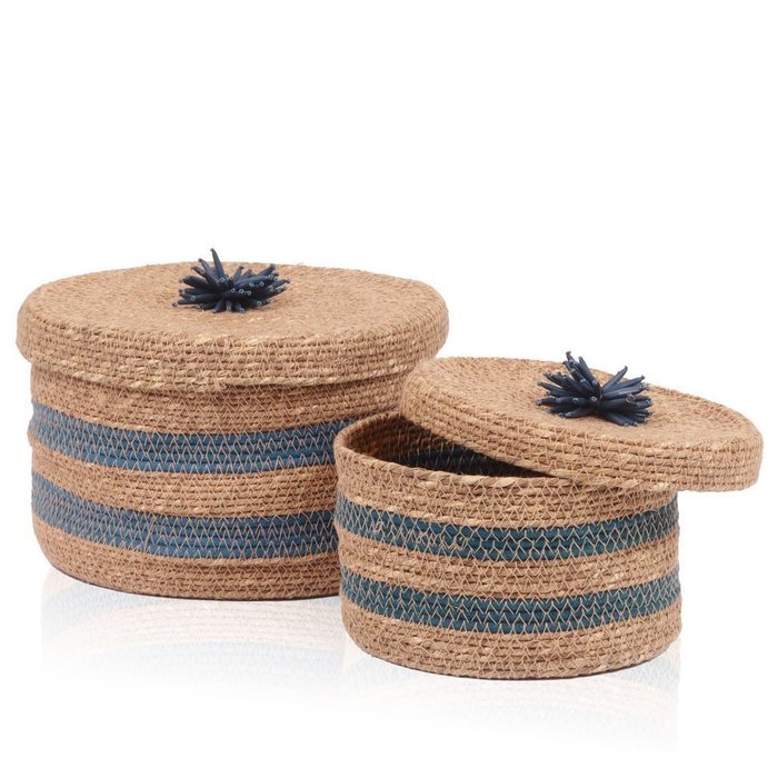Caixa Redonda em Palha C/ Detalhe Azul 17 Cm Azul