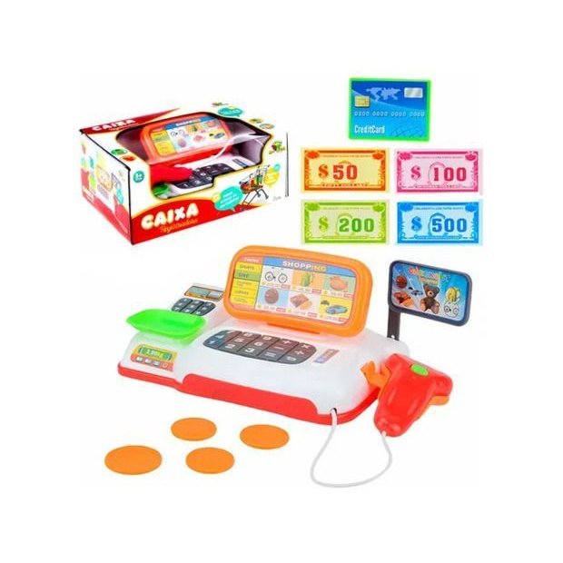 Conteúdo: 01 Caixa Registradora, 01 Scanner, 01 Cartão, 04 Moedas, 04 Cédulas, 01 Plaquinha.
