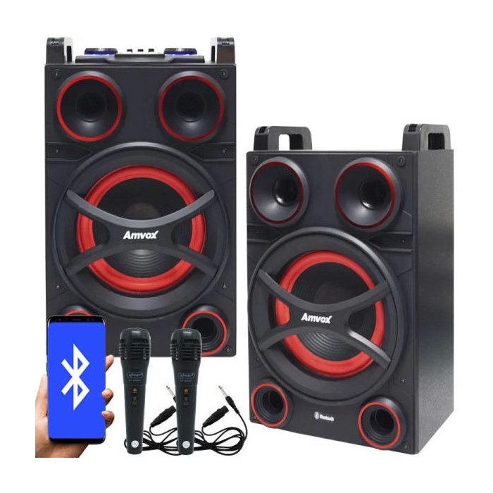 Caixa Som Amplificada Bluetooth 1000W Rms Ativa Passiva 2 Microfones Mp3 USB LED Amvox Aca 1010
