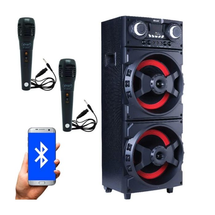 Surpreenda-se com a Caixa Amplificada ACA 1001, com leds rgb, colorindo muito mais sua festa! Praticidade, design inovador e muita, mais muita potência em uma caixa de som. A caixa Amplificada ACA 1001 possui entrada USB, SD, RÁDIO FM, entrada para microfone e instrumentos musicais, rodinhas e alças laterais para facilitar na hora do transporte. Sua potência é de 1.000W Rms com 2 Subwoofer de 12´´ e 2 Tweeters de 6,5´´. Leve a sua festa para qualquer lugar! Informações técnicas caixa amplificada Produto: Novo Marca: Amvox Modelo: ACA 1001 Cor: Preta Voltagem: 110/220V (bivolt chaveado) Potência: 1.000W Rms Diâmetro do alto-falante: 12´´ (2 unidades) Diâmetro do tweeter: 6,5´´ (2 unidades) Luz com indicação de funcionamento: Sim Botão liga/desliga: Sim Botão liga/desliga led: Sim Display em led: Sim Alça de transporte: Sim (retrátil) Alça lateral: Sim Led RGB: Sim Rodizios: Sim Recursos de áudio Leitura de arquivos por pasta: Não Função gravar (REC): Não Formatos de áudio: MP3 Rádio Frequência: FM Busca automática de estações: Sim Memoriza estações: Sim Conectividade Bluetooth: Sim Entrada USB: Sim Entrada SD Card: Sim Entrada auxiliar: Sim Entrada para microfone 1: Sim Entrada para microfone 2: Sim Entrada para instrumentos: Sim Informações técnicas microfone Produto: Novo Marca: Knup Modelo: KP-M0001 Cor: Preto Conector: P10 (6,5mm) Impedância em 1KHz: 600 Ohms Resposta frequência: 80Hz à 15KHz Sensibilidade: 1KHz (campo livre, sem carga) Sensitividade ao campo magnético 50Hz: <2uV/Ut Botão liga/desliga: Sim Especificações - Alta sensibilidade - Reprodução vocal com clareza - Chave liga/desliga com indicador - Microfones dinâmicos com excelente projeção vocal - Aplicação versátil e construção robusta a níveis profissionais - Baixíssima distorção com sinal super limpo Peso e medidas (aproximados) Medidas da caixa de som: 102 x 41 x 35 cm (altura x largura x profundidade) Medidas do microfone: 4 x 17 cm (diâmetro x comprimento) Comprimento do cabo do microfone: 1,00 m Comprimento do cabo da fonte de alimentação caixa de som: 1,70 m Medidas da embalagem: 52 x 46 x 105 cm (altura x largura x comprimento) Peso bruto: 24,14 Kg Itens inclusos: 1 Caixa de Som Bluetooth, 1 Cabo Auxiliar, 2 Microfone, 2 Cabo do Microfone, 1 Manual (português) Garantia de fábrica: 1 ano (Caixa de Som Bluetooth Amvox ACA 1001) Garantia do vendedor: 6 meses (Microfone com Fio Knup KP-M0001)