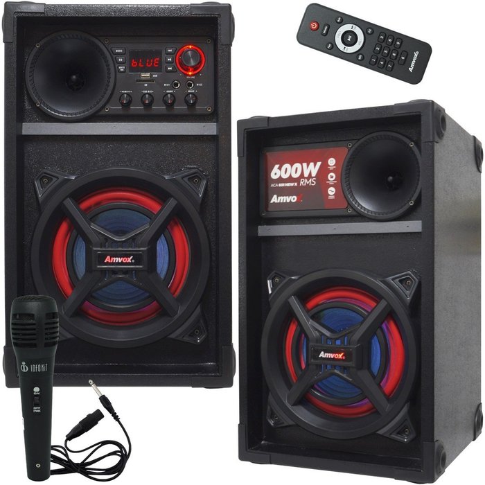Surpreenda-se com a caixa amplificada ACA 601 NEW X, composta por uma caixa ativa e uma caixa passiva com iluminação rítmica. Ela te proporciona 600W RMS de potência e incrível fidelidade sonora. Agora com a nova função TWS, onde permite que até duas caixas da mesma família funcionem simultaneamente com até 10 metros de distância de uma caixa para outra, conectadas a um único Smartphone, proporcionando aumento significativo de potência. Não utilize cabos! Com a Caixa de som amplificadora da Amvox você utiliza a tecnologia Bluetooth e pareia seu smartphone, notebook ou tablet para reproduzir sua playlist completa em mp3. Utilize ainda o conector de microfone ou instrumentos, faça incríveis apresentações, palestras, stand-ups ou cante muito via karaokê. Divirta-se!