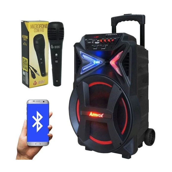Com a caixa amplificada portátil bateria, modelo ACA 292 da Amvox, você faz a festa em qualquer lugar do planeta. Portátil, retrátil e super leve, ela te proporciona 290W RMS de potência e incrível fidelidade sonora. Não utilize cabos! Com a Caixa de som amplificadora da Amvox você utiliza a tecnologia Bluetooth e pareia seu smartphone, notebook ou tablet para reproduzir sua playlist completa em mp3. Utilize ainda o conector de microfone ou instrumentos, faça incríveis apresentações, palestras, stand-ups ou cante muito via karaokê. Divirta-se! Informações técnicas caixa amplificada Produto: Novo Marca: Amvox Modelo: ACA 292 NEW Cor: Preta Voltagem: 110/220V (bivolt automático) Potência: 290W Rms Diâmetro do alto-falante: 12 polegadas Diâmetro do tweeter: 6,5 polegadas Luz com indicação de funcionamento: Sim Luz com indicação de carga da bateria: Sim Bateria: Interna recarregável Autonomia: Até 4 horas Botão liga/desliga: Sim Função gravar: Sim Display em led: Sim Encaixe para pedestal: Sim Alça de transporte: Sim (retrátil) Alça lateral: Sim Led RGB: Sim Rodizios: Sim Recursos de áudio Leitura de arquivos por pasta: Não Função gravar (REC): Sim Formatos de áudio: MP3 Rádio Frequência: FM Busca automática de estações: Sim Memoriza estações: Sim Conectividade Bluetooth: Sim Entrada USB: Sim Entrada SD Card: Sim Entrada auxiliar: Sim, P2 Entrada para microfone ou instrumentos: Sim, P10 Informações técnicas microfone Produto: Novo Marca: Infokit Modelo: MIC-PF10 Cor: Preto Conector: P10 (6,5mm) Impedância: 600 Ohms Resposta frequência: 78,2 à 20K Hz Sensibilidade: 73dB +/- 3dB Botão liga/desliga: Sim Especificações - Alta sensibilidade - Reprodução vocal com clareza - Chave liga/desliga com indicador - Microfones dinâmicos com excelente projeção vocal - Aplicação versátil e construção robusta a níveis profissionais - Baixíssima distorção com sinal super limpo Peso e medidas (aproximados) Medidas da caixa de som: 54 x 35 x 30 cm (altura x largura x profundidade) Medidas do microfone: 4 x 17 cm (diâmetro x comprimento) Comprimento do cabo do microfone: 1,50 m Comprimento do cabo da fonte de alimentação caixa de som: 1,15 m Medidas do furo para pedestal: 3,5 x 4 cm (diâmetro x profundidade) Medidas da embalagem: 43 x 38 x 59 cm (altura x largura x comprimento) Peso bruto: 7,91 Kg Itens inclusos: 1 Caixa de Som Bluetooth, 1 Cabo Auxiliar, 1 Fonte de Alimentação, 1 Microfone, 1 Cabo do Microfone, 1 Manual (português)
