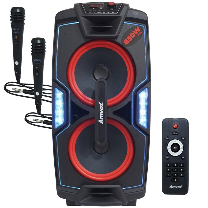 Caixa Som Amplificada Portátil Bluetooth 850W Rms Led Tws Bateria Amvox 2 Microfones ACA 850 Festa