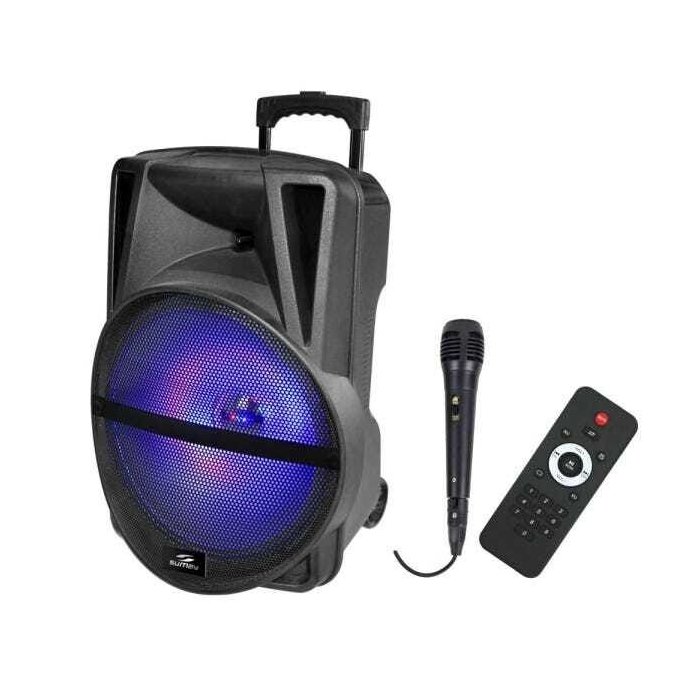 Caixa de Som Portátil PRIMUS 500 BT Se você gosta de música, vai querer ouvir sua playlist na Caixa de Som Portátil da Sumay. Ela possui um sistema de som de altíssima qualidade com 500W de potência musical, com duração de bateria de até 06 horas. A Caixa de Som Amplificada Portátil PRIMUS 500 BT possui alça e rodas para facilitar o transporte. Ouça suas músicas através de uma conexão Bluetooth, USB, Cartão de Memória SD, Rádio FM ou por uma entrada AUX. Ou se preferir, faça um karaokê, conecte um microfone a Caixa de Som e comece a cantar. Carregador DC Power + Display de LED integrado, verdadeira fera!