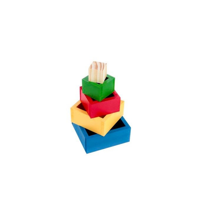 Descritivo detalhado: Confeccionada em M.D.F. e madeira - 4 peças coloridas pintadas com tinta esmalte sintético atóxico nas cores vermelho, verde, amarelo e azul, mais 1 peça de madeira crua.