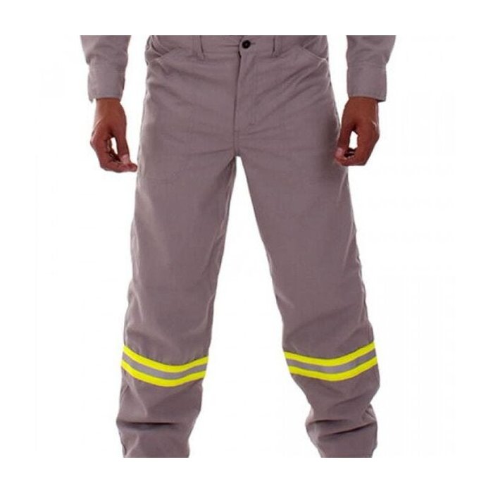 CA: 33.517 Aspectos Gerais: Confeccionada em tecido Uniforte FR 100% Algodão 8oz (290 g/m²); ATPV 11.3 cal/cm²; com faixas refletivas retardantes a chamas (antichamas); meio elástico no cós e passantes para cinto, com pala atrás e fechamento em botões com vista. Dois bolsos frontais e dois traseiros. Costura reforçada com linha retardante a chamas 100% meta-aramida. Ideal para: Proteção das pernas do usuário contra agentes térmicos provenientes de arco elétrico e fogo repentino.