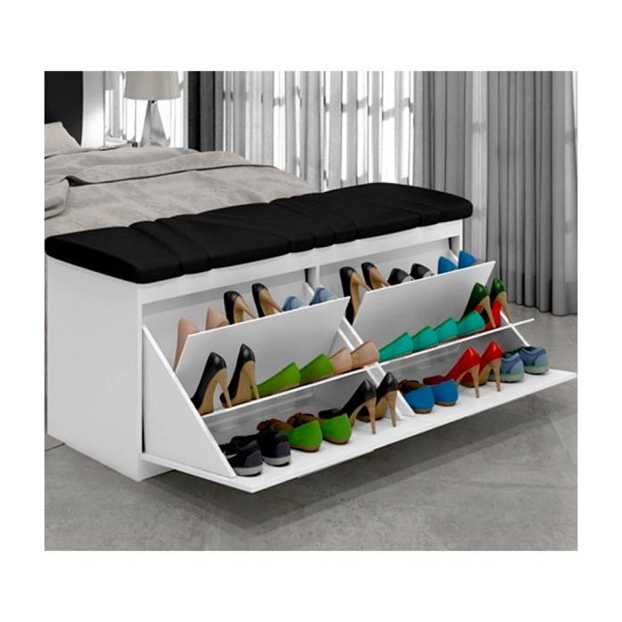 Calçadeira Sapateira New Mille, 2 portas com espaços para acomodar calçados aberto ou fechado, como chinelos, tênis sandálias e outros. Além de organizar melhor os calçados a Calçadeira Sapateira New Mille possui tampo superior em MDP de 15mm, que pode ser usado como assento para colocação de calçado, o tampo da Calçadeira Sapateira New Mille é fabricado com espuma D20 e revestimenro em tecido suede, seu quarto ficará muito mais organizado e chamorso com a Calçadeira Sapateira New Mille. Com estrutura em Mdp 15mm, e dobradiças metálicas nas portas a Calçadeira Sapateira New Mille é ideal para guardar até 18 pares de calçados e é ideal para cama com 140 cm de largura. O acabamento é feito em Pintura UV na cor Branco.