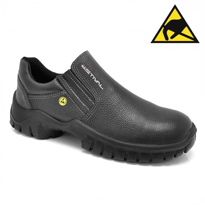 Calçado de segurança tipo sapato livre de metais com característica antiestática, confeccionada em couro relax, fechamento através de elástico, forro em material não tecido, palmilha de montagem com característica antiestática fixada no cabedal pelo sistema strobel, palmilha de conforto antiestática, biqueira plástica e solado antiestático indicado para ambientes explosivos, indústrias eletrônicas e indústrias químicas (o calçado irá descarregar a eletricidade estática do usuário).