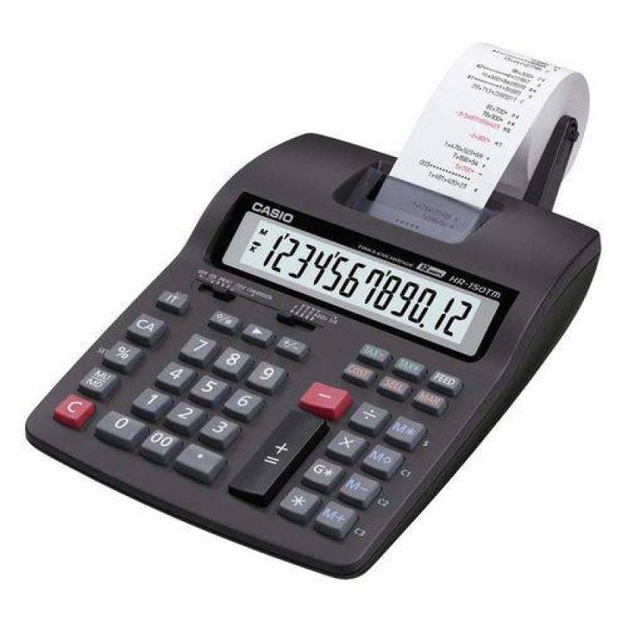 de percentual básico. -Impressão em 2 cores valores positivos exibidos em preto e valores negativos em vermelho facilitam a visualização, e tudo isso com visor de 12 dígitos. Informações técnicas: -Marca: Casio -Referência: Hr-150TM-Bk-AA4-Dh. -Cor: Preto -Modelo: Hr-150TM Linha Printer -Tipo de calculadora: De mesa com bobina. Visor: -Capacidade do visor: 01 linha com 12 dígitos. -Tamanho do visor: Visor amplo. Impressão: -Tipo de impressão: Em duas cores- Preto em Vermelho. -Velocidade de impressão: 2,4 linhas por segundo. -Tamanho da bobina de papel: 58 mm. -Seleção de modo Alg: algébrico. Funções: -Chave liga/desliga: sim -Correção dígito a dígito: Sim -Desligamento automático: sim -Recursos matemáticos: Sim Cálculo de Mark Up/Mark down Custo/ Venda/ Margem: Calcula o custo, o preço de venda ou a margem de lucro de um item a partir de dois valores dados. Função de alíquotas e câmbio: Funções de cálculo de alíquota e conversão de moeda. Recursos financeiros/de negócios Alimentação: -Número de pilhas/bateria: 4 pilhas Aa não inclusa / Fonte bivolt inclusa R6. -Tipo de pilha/bateria: Aa. -Tensão da pilha/bateria: 1,5 Volts. -Peso do produto: 800 gramas. -Peso do produto com embalagem 984 gramas. -Dimensões do produto -Largura 19,6 cm. -Altura 5,87 cm. -Profundidade 27,2 cm. Garantia: -Prazo 01 ano (3 meses de garantia legal e mais 9 meses de garantia especial concedida pelo fabricante). Informações Adicionais: Mu–Md – Mark-Up/Mark-Down Todas as funcionalidades de mark-up/mark-down de uma máquina de calcular custos e lucro simplificado. -Line Print: Impressão em linha -Dígitos: 12 Dígitos Itens inclusos:- 01 Calculadora- 01 Manual de usuário- 01 Termo de garantia.