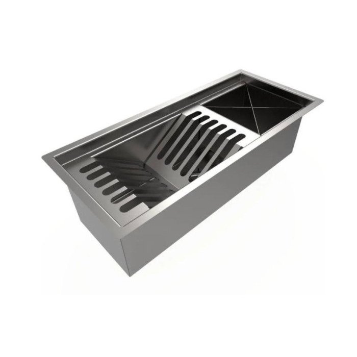 Produto utilizado para suporte de louças, copos, talheres e utensílios de cozinha após a lavação e enxágue. Tradicionalmente conhecido como escorredor de louças, o Canal Organizador vai completar sua cozinha e espaço gourmet. Canal Organizador traz praticidade e sofisticação para seu projeto, podendo ser instalada no granito, corian, madeira entre outros materiais. Instalação sobreposta ou embutida sob o tampo. A calha irá coletar toda água dos escorredores e escoará diretamente pelo esgoto através de um dreno no centro da peça o qual poderá ser ligado no sifão da cuba ou em um ponto exclusivo de esgoto para calha. Produto de fácil instalação.   Módulo menor contém: 01 módulos para pratos (total para 06 pratos), 01 módulo com 04 recipientes para talheres e utensílios.   Não acompanha louças, talheres, etc.   Medidas externas: 482 x 213 x 140 mm (CxLxP) Medida útil: 454x155x140 mm Medidas para corte da bancada: 460 x 190mm (C x L) Profundidade: 140 mm