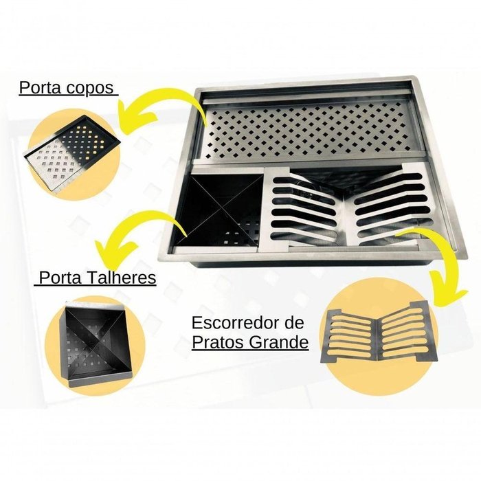 Produto de fácil instalação.Módulo maior contém: 01 módulos para pratos (total para 6 pratos), 01 grande módulo para copos, 01 módulo com 04 recipientes para talheres e utensílios. (essas partes são removíveis, podendo dividir em apenas 2 partes ou serem retirados para o módulo ficar livre) servindo para talheres ou bucha e detergente.