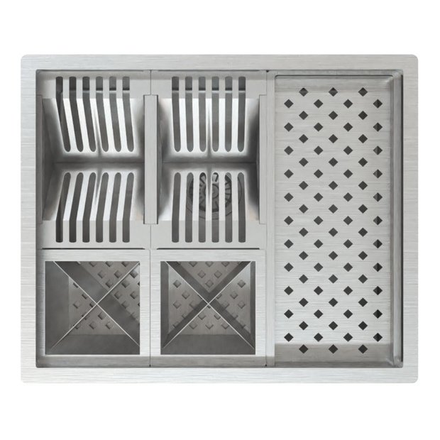 Módulo maior contém: 02 módulos para pratos (total para 12 pratos), 01 grande módulo para copos, 02 módulo com 08 recipientes para talheres e utensílios. (essas partes são removíveis, podendo dividir em apenas 2 partes ou serem retirados para o módulo ficar livre) servindo para talheres, bucha e detergente ou até mesmo vaso de flores.