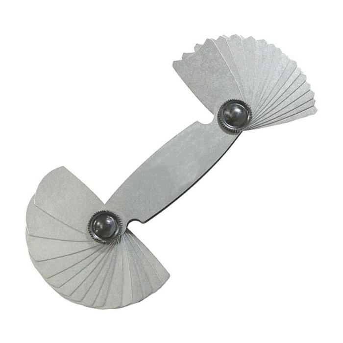 Calibrador De Raio Em Aço Inox - Cap. 7,5 - 15,0mm O QUE É O CÁLIBRE DE RAIO O pente de rosca, ou simplesmente Cálibre de Raio, é uma ferramenta capaz de realizar a verificação das medidas de passo na rosca. Cada modelo possui uma quantidade de pente em seu conjunto, variando de 1,0 à 15,0mm os modelos mais simples. Para utilizar a ferramenta é bem simples, basta abrir a medida necessária e através de seu passo, verificar a compatibilidade na rosca encostando no material. ESPECIFICAÇÕES TÉCNICAS DO PENTE DE ROSCA - Marca: JG TOOLS;