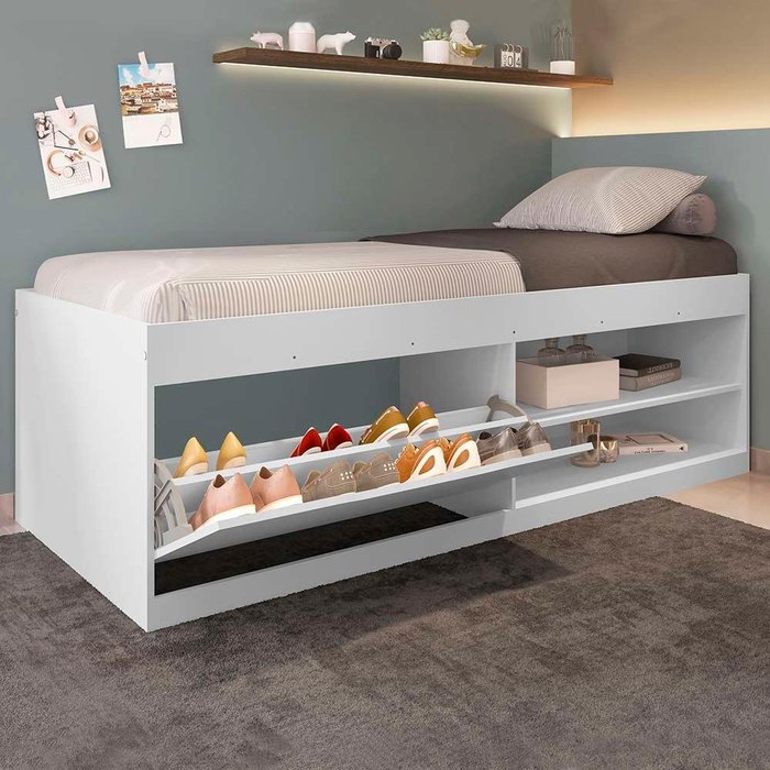 Cama Bau Solteiro Com Sapateira Embutida Branco Vanessa Framar
