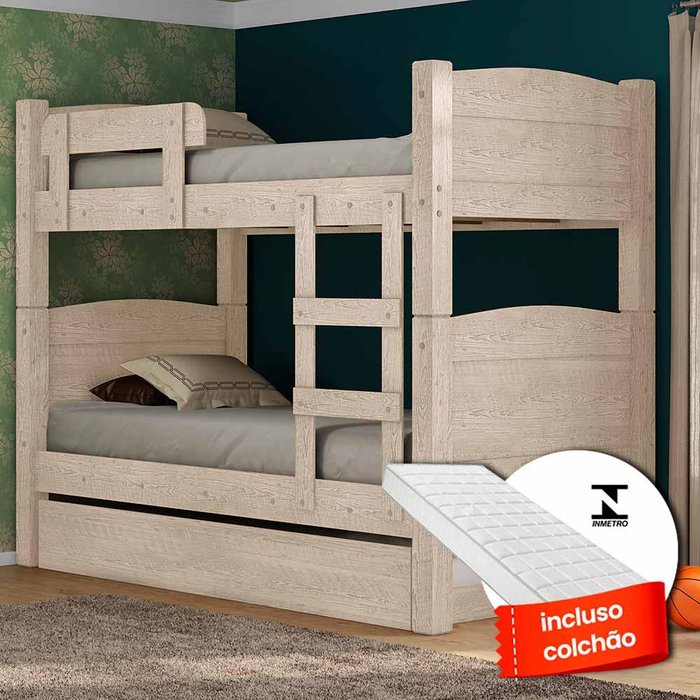 Dimensões: Largura 0,95m; Altura 1,62m; Profundidade 2,05m.Dimensões cama Auxiliar: Largura 0,93m; Altura 20,5m; Profundidade 1,89m.Itens Inclusos: 1 Beliche com Auxiliar e 3 colchões (88x188)- Otimização de espaço; - Design inovador; - Pode ser usada como beliche ou como duas camas.Complexidade de Montagem: Média, pode ser montado por mais de uma pessoa e/ou necessite de maior conhecimento para montagem.Recomendações de Uso, Manutenção e Limpeza: Limpar com flanela ou pano macio seco, não utilizar produtos abrasivos, desengordurantes, álcool ou solvente. Não expor o produto diretamente à luz solar e à umidade.Garantia: 3 mesesOBS: Foto meramente ilustrativa, objetos, utensílios e decoração não fazem parte do produto.