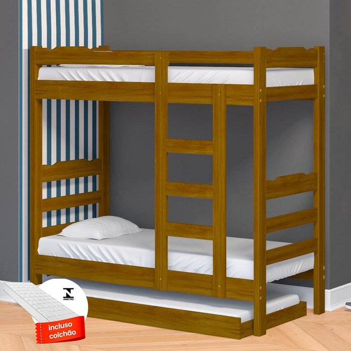 Cama Beliche Madeira Maciça Alta Com Auxiliar E 3 Colchões Solteiro Life Imbuia Nemargi Imbuia