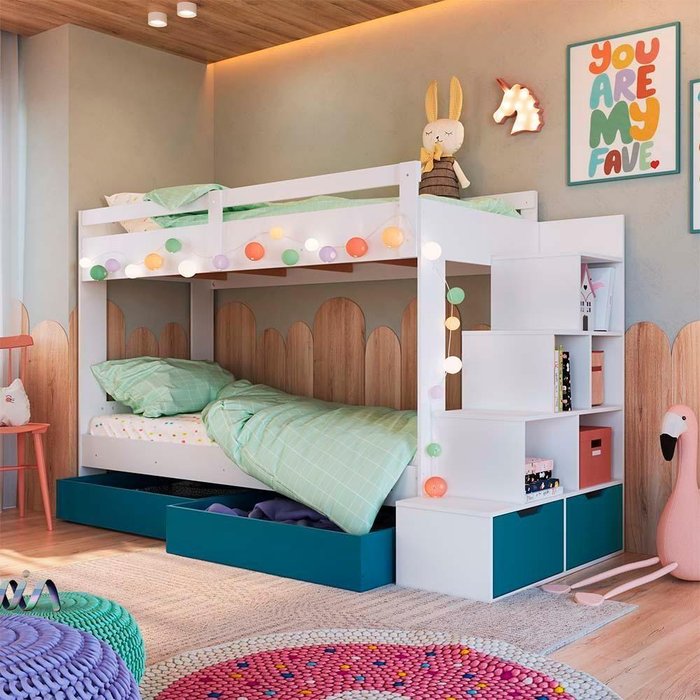 Cama Beliche Solteiro com 05 Nichos e 02 Colchões Branco Azul Decker Shop Jm
