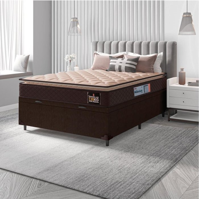 A Cama Box Baú Casal Millenium é uma combinação de beleza e conforto! Feita com materiais de alta qualidade, tecido Jacquard de toque macio e laterais em linho. Revestida com um tecido antiÁcaro e antifúngico, garantindo uma maior proteção e durabilidade, além de uma camada extra de maciez, com o pillow top. Suporta até 100kg por pessoa. Ela proporciona uma melhor noite de sono.